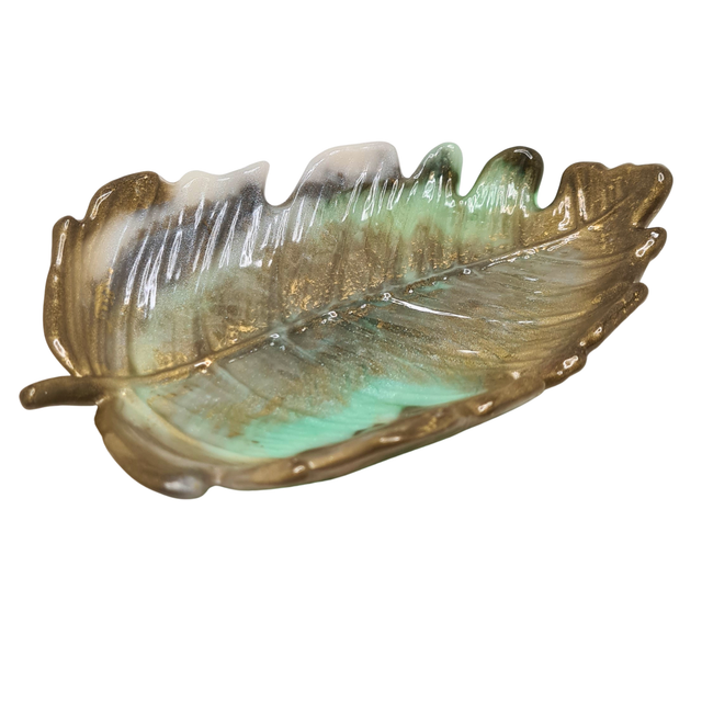 Handgefertigte Schale in Blattform aus Resin. Jede Schale ist ein Unikat mit fließenden Farbverläufen und natürlicher Struktur – ideal als Schmuckablage, Räucherschale oder dekoratives Objekt.