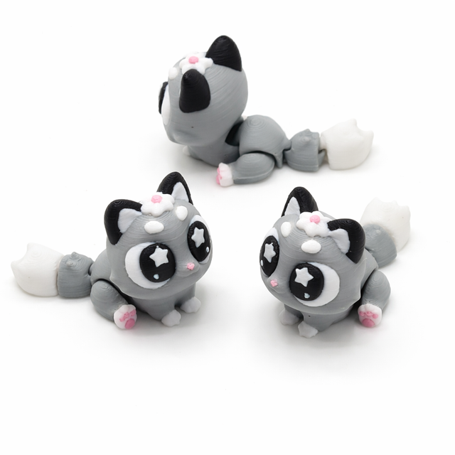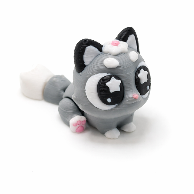 Flexi Katze – bewegliche 3D-gedruckte Dekofigur mit Sternen in den Augen. Niedliche Katze im Comic-Stil, ca. 5,5 cm groß, ideal als Geschenk, Dekoration oder Sammlerfigur. Kein Spielzeug.