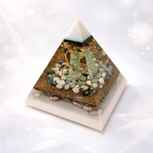 Edle Epoxidharz-Pyramide mit Kupfer, Messing und Jade – harmonische Energie in modernem Design.